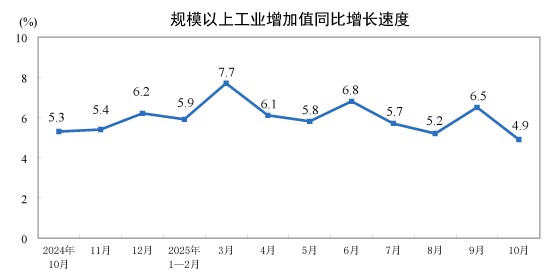 10月份,規模以上工業增加值同比實際增長4.9%(增加值增速均為扣除價格因素的實際增長率)。從環比看,10月份,規模以上工業增加值比上月增長0.17%。1-10月份,規模以上工業增加值同比增長6.1%。